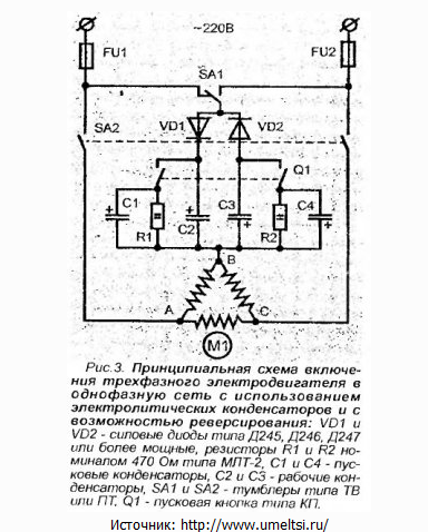 Подобная схема включения трехфазного электродвигателя в однофазную сеть с использованием электролитических конденсаторов показана на рисунке 3. Здесь бумажный рабочий конденсатор заменен двумя электролитическими С2 и СЗ, а пусковой — конденсаторами С1 и С4. Можно использовать конденсаторы типов К5-35, К50-20 или ЭТО на напряжение 250 В. В каждой ветви стоит мощный силовой диод, пропускающий ток в одном направлении. Диоды следует использовать с рабочим током порядка 10 А и выше.