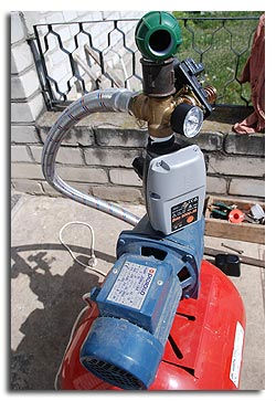Со станцией получился небольшой проблем, о котором расскажу немного забегая вперед. Все соединения изначально я посадил на тефлоновую ленту, т.к. именно ее мне советовали использовать в магазине, где покупал устройство защиты от сухого хода для насоса, у этого устройства вход и выход пластмассовые и использование пакли могло повредить резьбу. Но толи я не умею пользоваться этим тефлоном, толи что-то не так делал, в общем после монтажа и запуска насосной станции под давлением стыки немного пропускали воду, пришлось все заново аккуратно перепаковывать, на этот раз уже паклей, ничего не сломал Собрать насосную станцию оказалось очень легко – на гидроаккумулятор закрепил насос, на насос накрутил защиту от сухого хода, далее латунный пятерник и в пятерник все подсоединил по стандартной схеме – манометр, соединительный шланг к баку, реле давления. Электричество подключил таким образом – от розетки сначала подключается реле давления, от реле давления напряжение поступает на защиту сухого хода и потом уже поступает на насос. Здесь есть один техникал трик, который я применил и делюсь с вами секретом – у нас в деревне напряжение не постоянно равно 220 вольт, сами знаете, то сваркой сосед подсаживает линию, то еще чем-то. Чтобы насос не сгорел (сгореть он может при длительной работе когда напряжение в сети пониженное, например 180 вольт, в таком случае для обеспечения необходимой мощности увеличивается ток (закон Ома), в следствие чего перегревается обмотка двигателя и насос выходит из строя) необходимо контролировать силу тока в цепи питания насоса. У моего насоса мощность 600 Вт, т.е. при оптимальном напряжении 220 вольт он потребляет ток 2,7 А. Таким образом для защиты от перегрева в цепь перед насосом я врезал автомат на 3А, который выключит насос при повышенном потреблении тока (при напряжении в сети 180 вольт ток в моем случае будет равен 3,3 А).