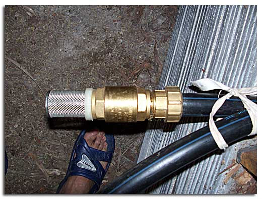 Установил станцию в домик, подключил выход к предварительно закопанной на небольшую глубину трубе ПНД 25 мм. На вход поставил также трубу ПНД но уже 32 мм, опустил ее в колодец и на конце трубы что в колодце установил фильтр и обратный клапан. Обратный клапан необходим, т.к. условием работы насоса является обязательное присутствие воды на входе, для чего у насоса есть специальное заливное отверстие, через которое необходимо заливать воду перед его запуском. Клапан держит воду в трубе и не позволяет ей вытекать в колодец когда вы наливаете в насос воду перед первым запуском. Но пользоваться этим заливным отверстием крайне неудобно — необходим инструмент чтобы открутить заглушку и т.к. система должна быть герметичной, не совсем удобно потом заглушку садить на паклю … Для удобства пользования я решил на входе в насос врезать тройник и по нему через шаровый кран заливать воду в систему перед первым запуском (на фотографии видно эту фишку, в качестве лейки стоит обрезанная пластиковая бутылка).