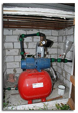 Все эти факторы сподвигнули меня сделать нормальный водопровод на даче как для пользования в доме так и для полива и летом 2006 года я начал …. Первое что было сделано, так это была выбрана схема подачи воды. Изначально я планировал установить накопительный бак на 2-м этаже в доме, литров на 200, с поплавком – поплавок упал ниже определенного уровня, насос включился и подкачал воды до необходимого уровня – по такой схеме вода по принципу соединяющихся сосудов поступала бы во все точки водозабора. Но потом я решил изменить схему, т.к. при самотеке нельзя установить водонагревательную газовую колонку (давления воды на входе не хватает), да и полив при таком естественном давлении не ахти какой. В общем, решил делать насосную станцию: закупил гидробак ELBI AF-CE на 50 литров, реле давления PM5 , манометр и защиту от холостого хода (Brio 2000-m) , которая автоматически отключает насос когда в колодце заканчивается вода. Все комплектующие сделаны в Италии и по-моему имеют оптимальное соотношение цена/качество. Да, забыл сказать про условия на нашем участке – колодец находится вдали от дома, расстояние порядка 40 метров, от подошвы обуви до зеркала воды – 6 метров, столб воды в колодце примерно 1.6 метра. Хотелось бы конечно установить насос в доме, в подсобном помещении, но при таких расстояниях это невозможно, насос просто не сможет «всосать» воду. В общем как ни крути, а варианта всего 2 – ставить насос возле имеющегося колодца или копать новый колодец (бить скважину) прямо возле дома. Взвесив трудовые и денежные затраты решил построить рядом с имеющимся колодцем маленький домик и в нем поставить насосную станцию.