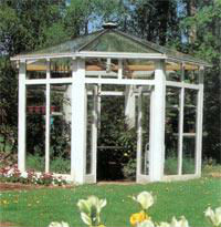 Собственно говоря, круглые теплицы вовсе не круглые. В зависимости от конструкции круглые теплицы подразделяются на шести-, восьми- и даже двенадцатиугольники. Тем не менее они кажутся круглыми и выглядят особенно элегантно. К сожалению, в таком типе строений плохая циркуляция воздуха. Воздухообмен будет лучше, если помимо форточек в крыше, в зависимости от размера теплицы, предусмотреть хотя бы одно дополнительное боковое окно или отдушину.