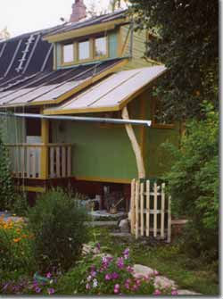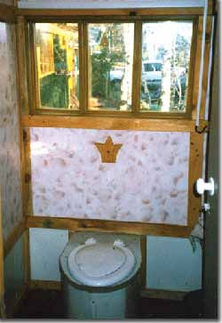 5. Внутренняя отделка. Тут я тоже поломал голову. Хотелось дворца, но, будучи стесненным в средствах, пришлось проявить изобретательность. Самым дешевым и гигиеничным вариантом оказалась самоклеющаяся пленка, наклеенная на ДВП. Но, чтобы придать оригинальности, я отделал все углы деревянными раскладками и наличниками, покрытыми пропиткой для дерева. Надо сказать, что, вопреки правилам, у меня в туалете большие окна. Конечно, не всем это нравится, но я «тащусь» от обилия естественного света. Стоишь, делаешь свои дела, ощущая себя капитаном лайнера. Высоко, весь участок, как на ладони. Короче говоря: «нет лучше красоты, чем … с высоты».