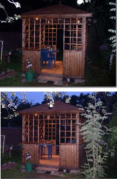 Покрасил беседку пинотексом, цвет орех. Пол покрыл корабельным лаком. Провел электропроводку для розетки, выключателя и лампочек. Доски с помощью которых нашел середину использовал для освещения вмонтировав в них цоколь для лампочек.