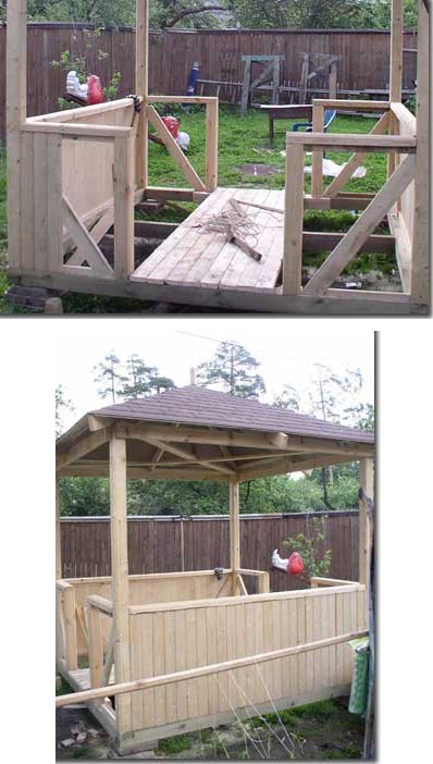 Размер основания 2,5Х2,5 метра, брусья 100Х100 крепились путем пропила на половину бруса. В моем случае основание было установлено на каменные плиты. Выровнял углы с помощью угольника и метра, получился квадрат с прямыми углами, затем основание выровнял уровнем по горизонтали и для дополнительной стяжки пола пустил брусок 100Х50 по середине. По уровню и угольнику установил столбы по углам, предварительно на столбах снял фаску ~1,5 см., высота столбов 2,2 метра. Столбы закрепил с помощью временных распорок, плюс к этому столбы закрепил на шурупы непосредственно к основанию. Затем обвязал верх столбов, бруском 100Х50 с 4-х сторон. Прикрутил перила с двух сторон из бруса 50Х100 (предварительно «закруглил» углы электрорубанком). Сделано.